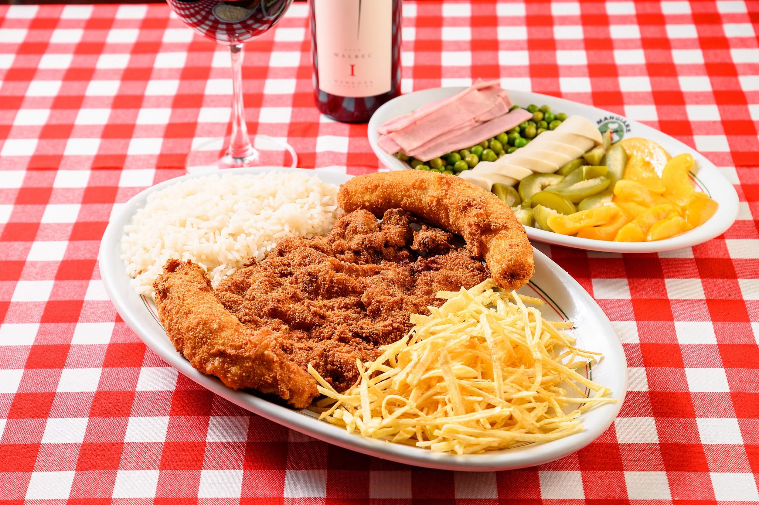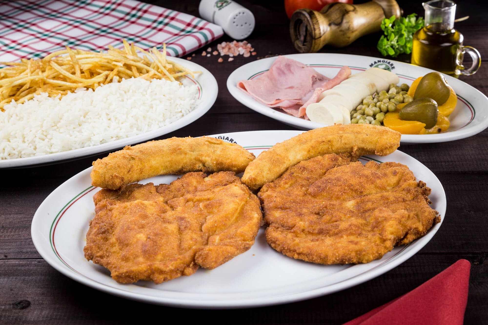 À milanesa, batata palha, ervilha, presunto, pêssego, figo e banana à milanesa