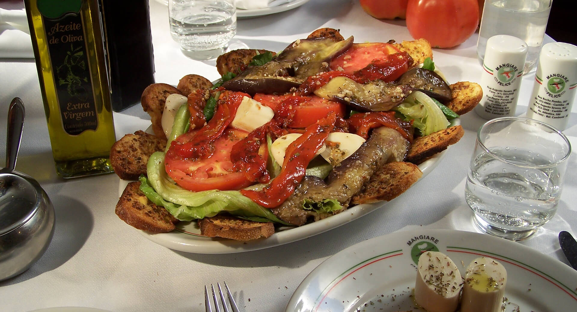 Tomate, palmito, cebola, cenoura, brócolis, berinjela, pimentão e torradas de alho.