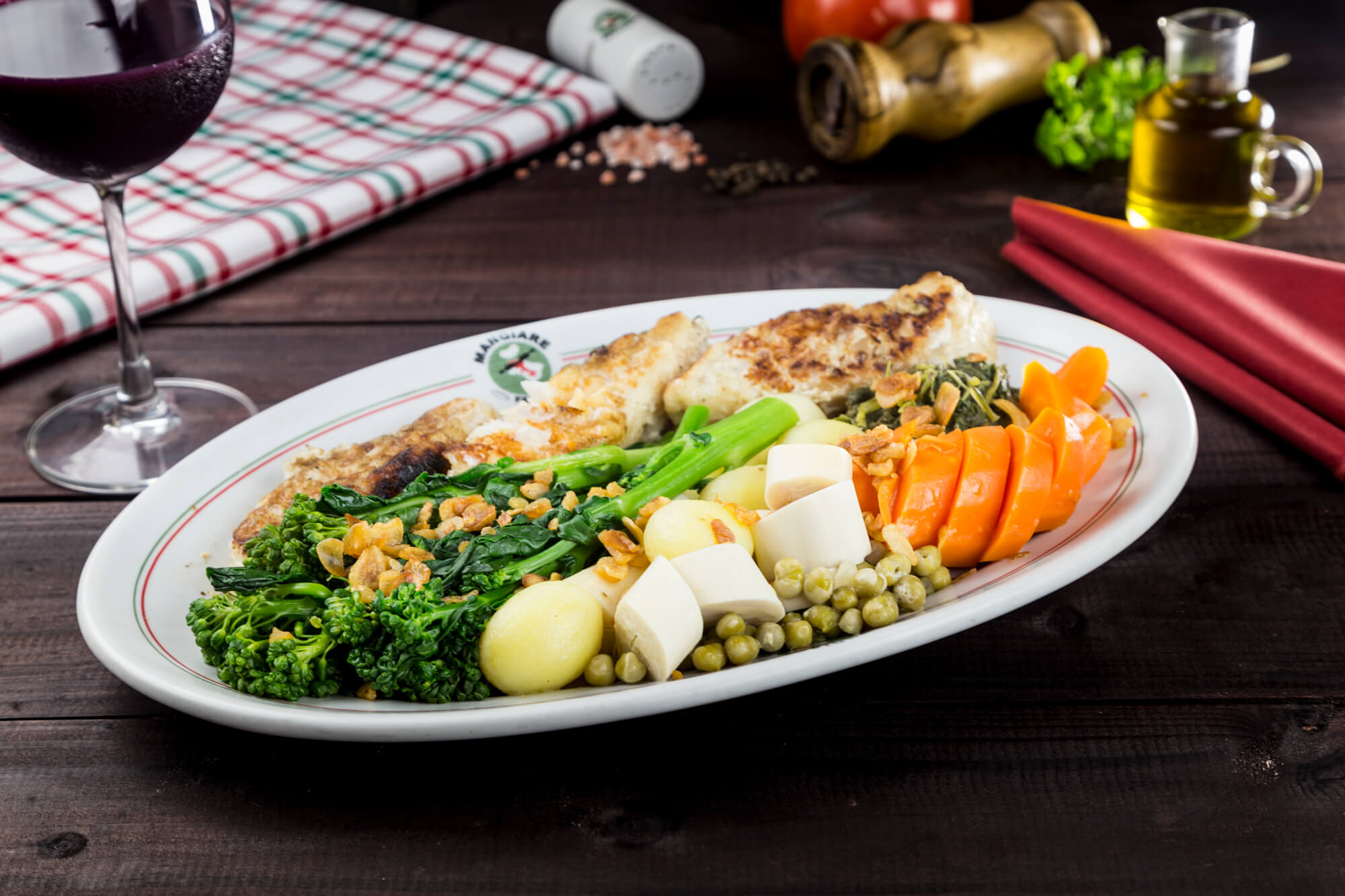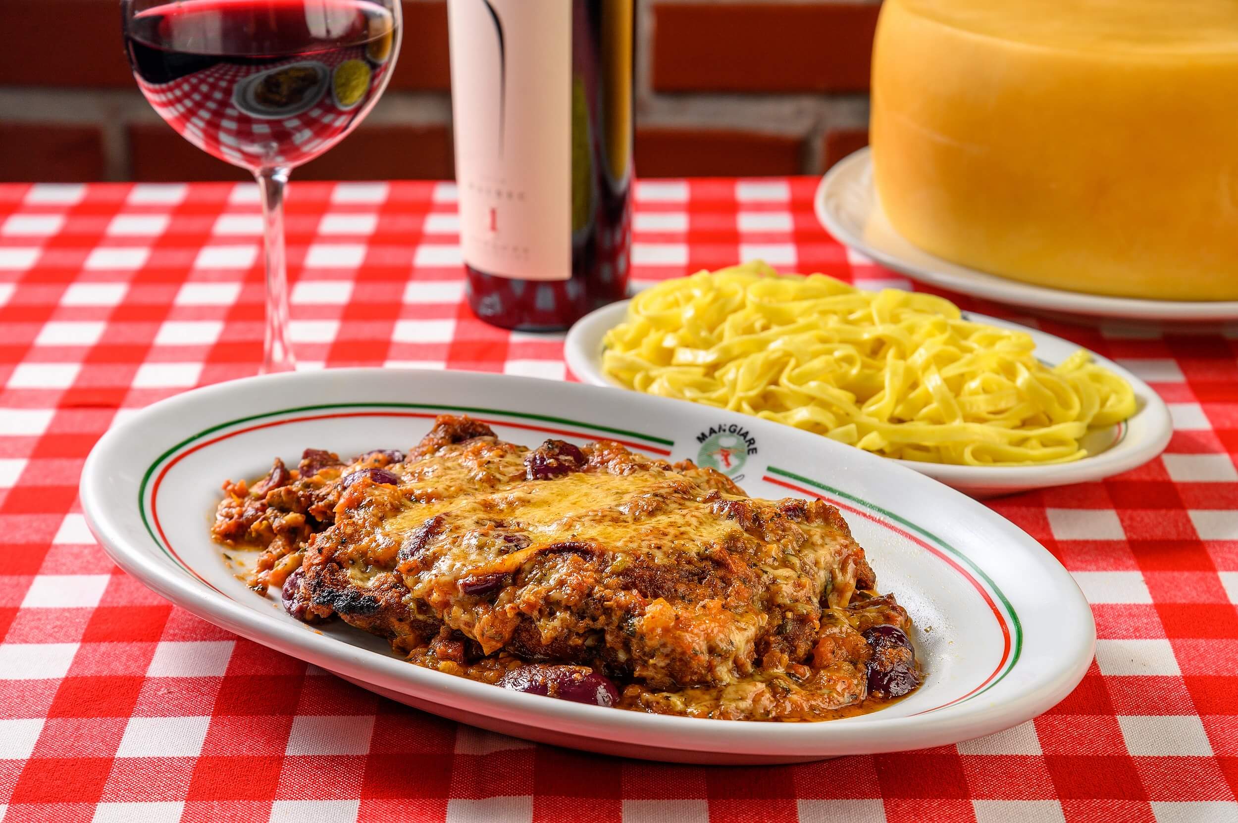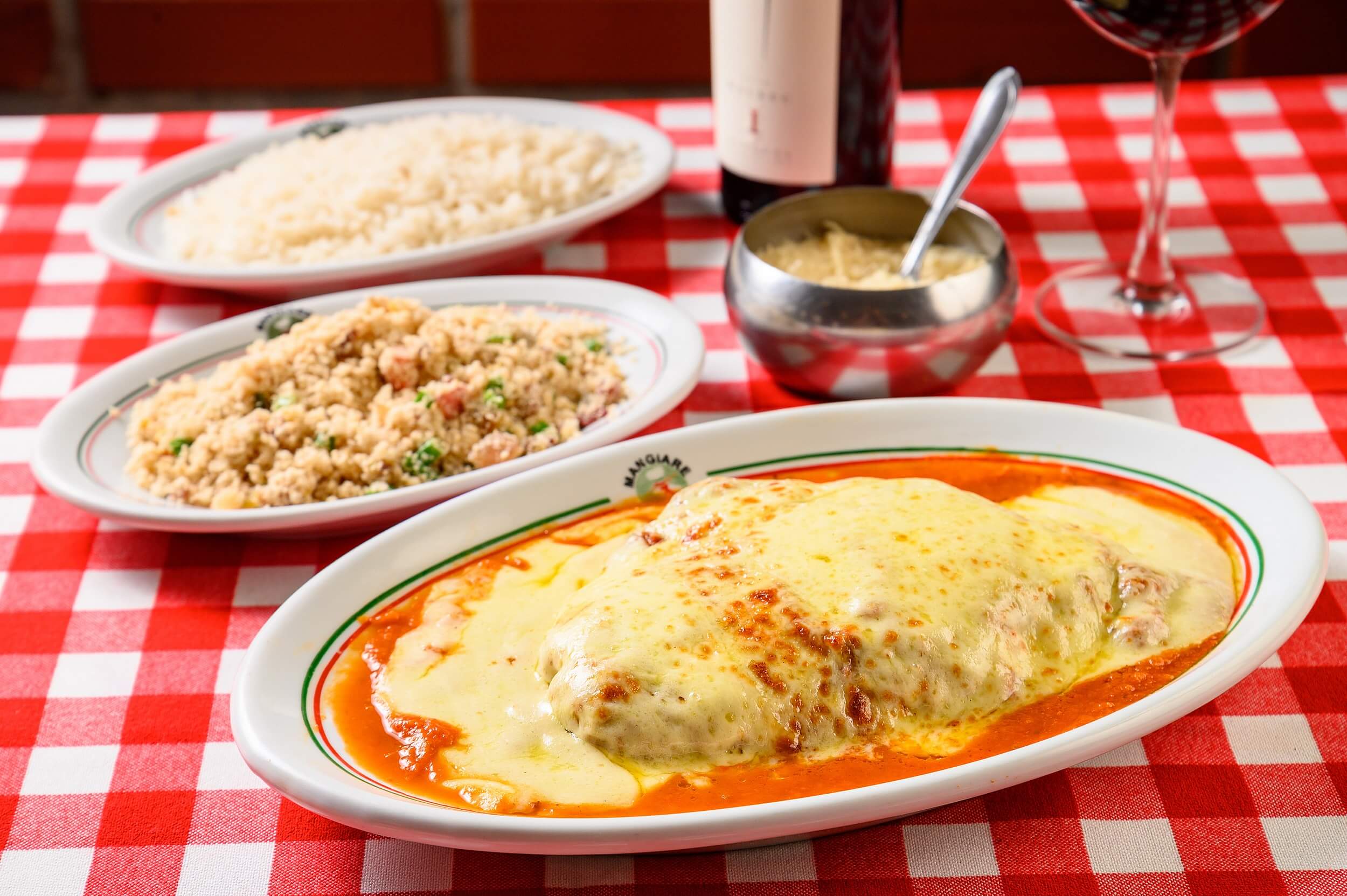Filé empanado, molho ao sugo, gratinado com muçarela. Com arroz e farofa ou arroz e fritas ou tagliarini na manteiga