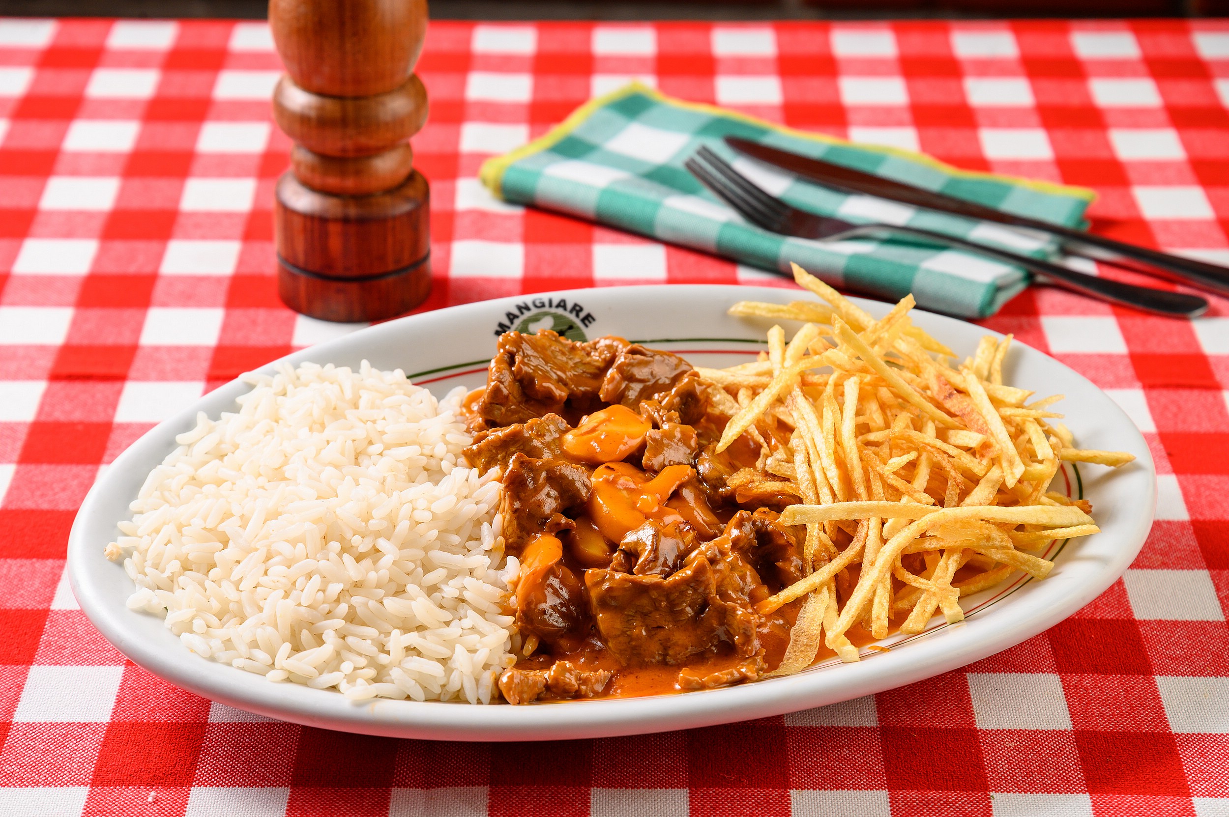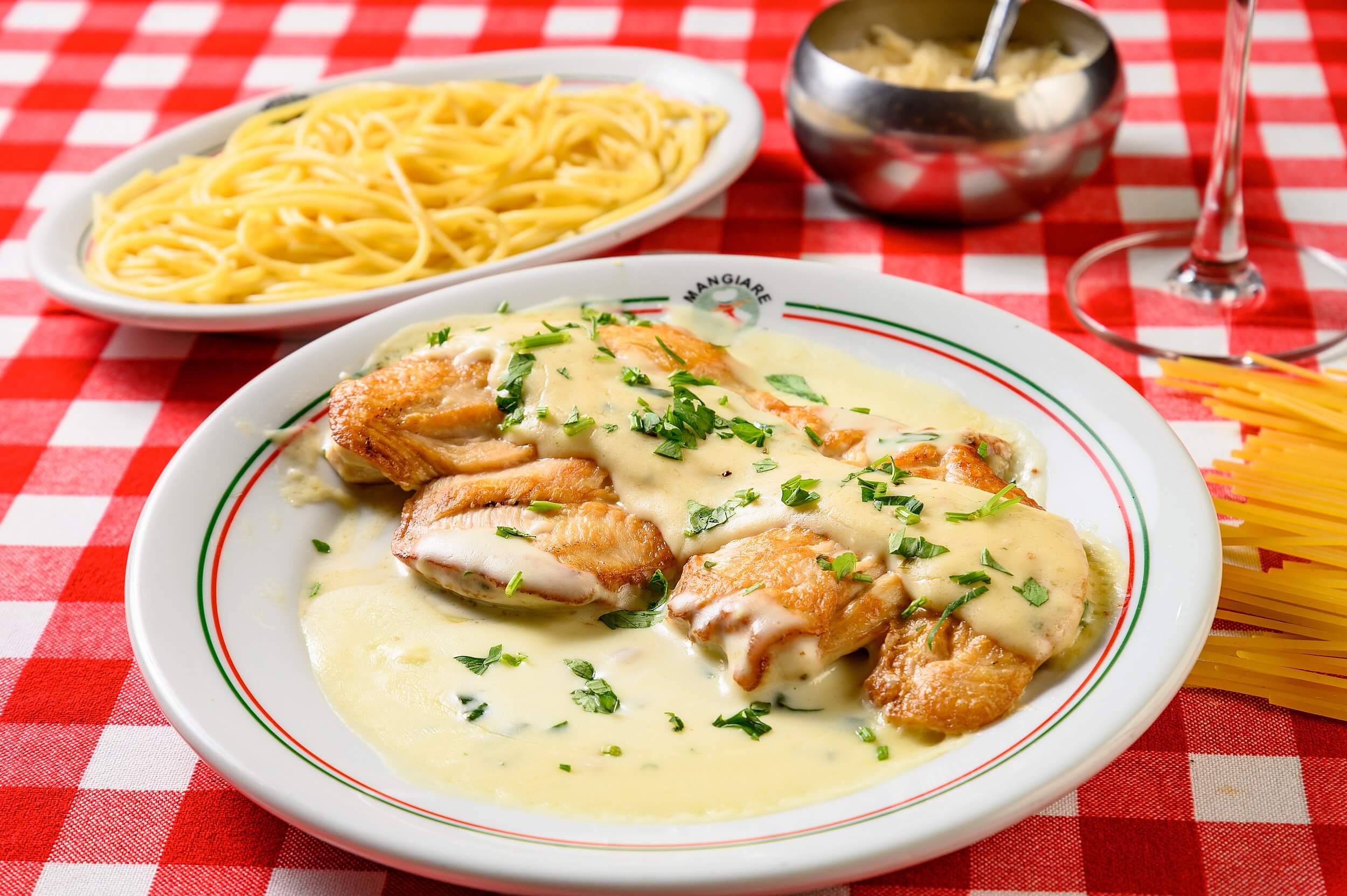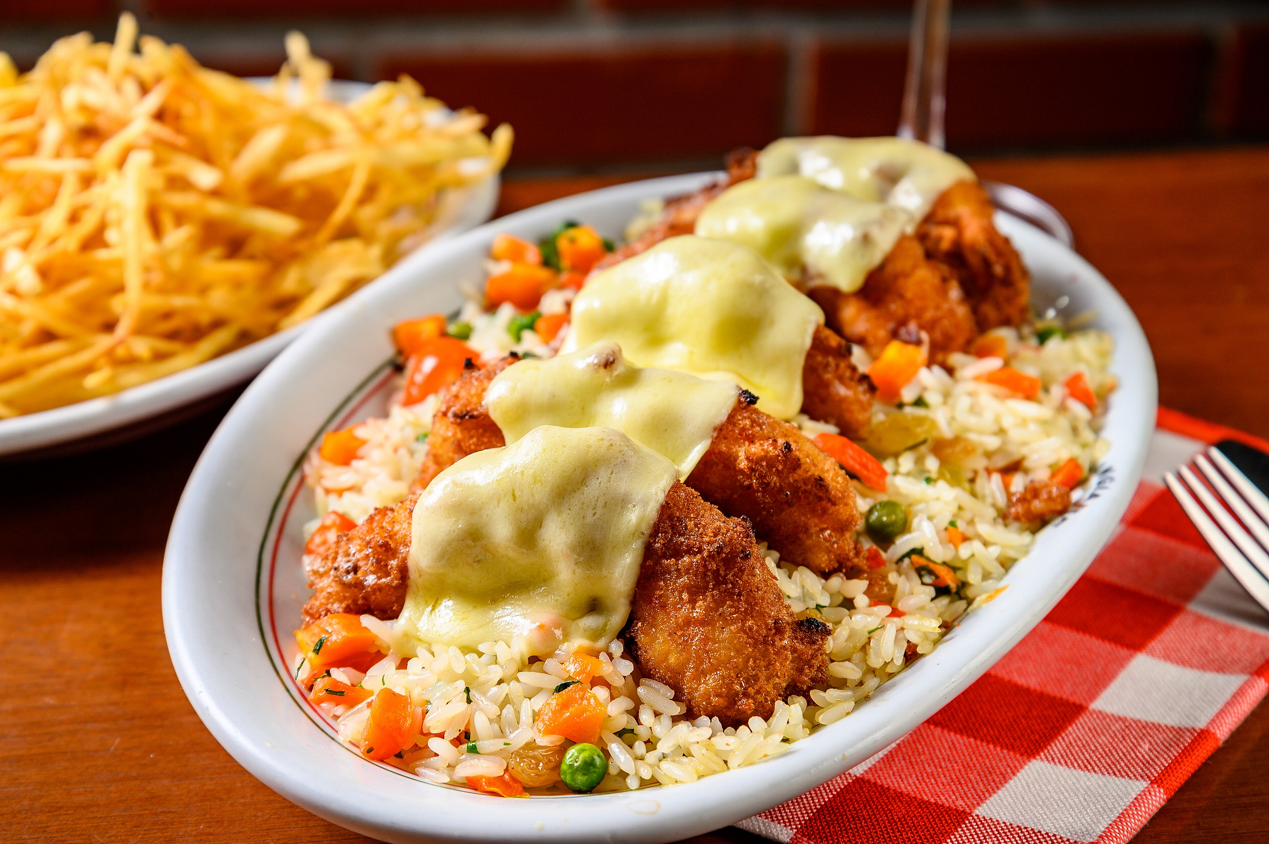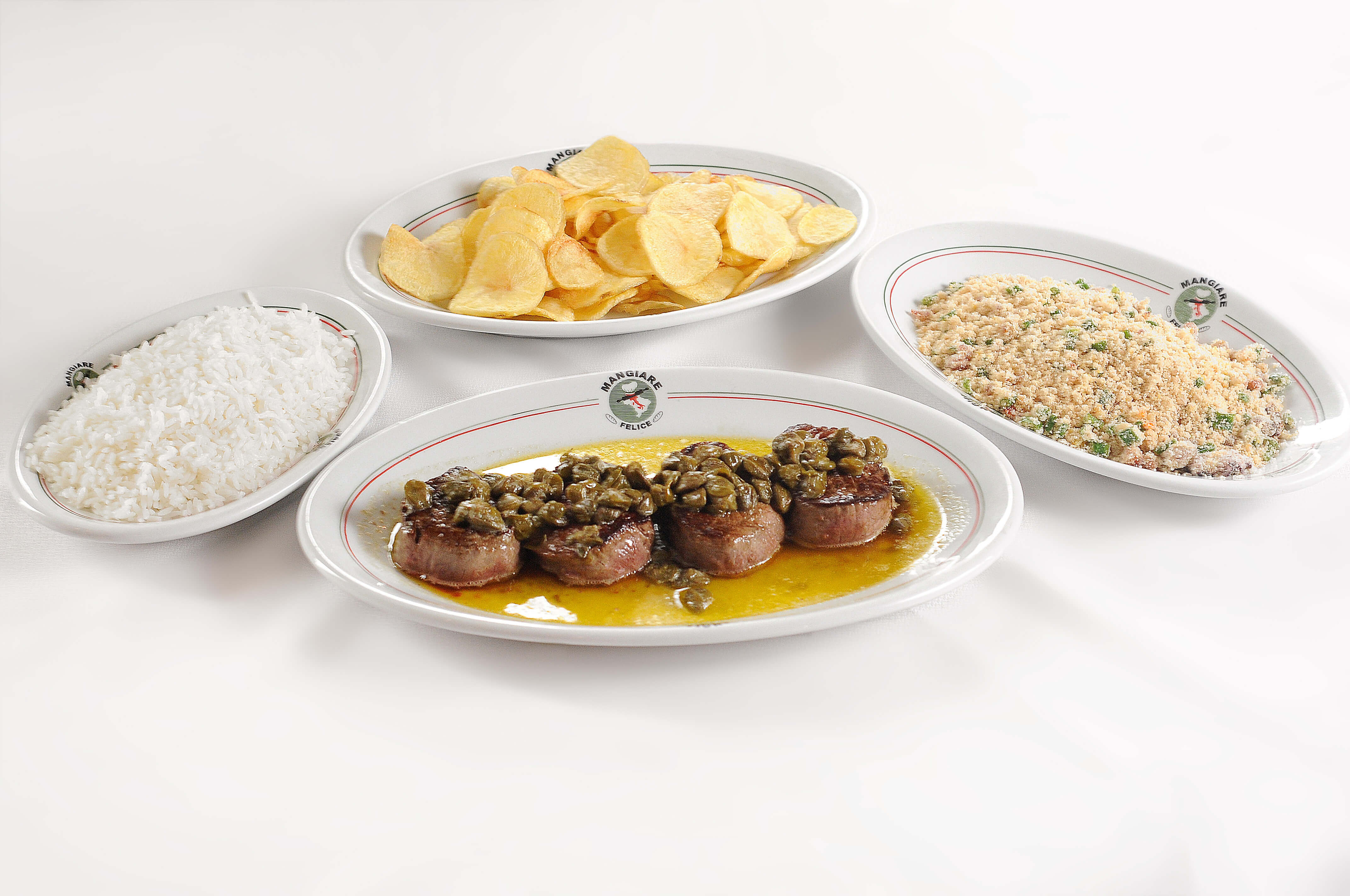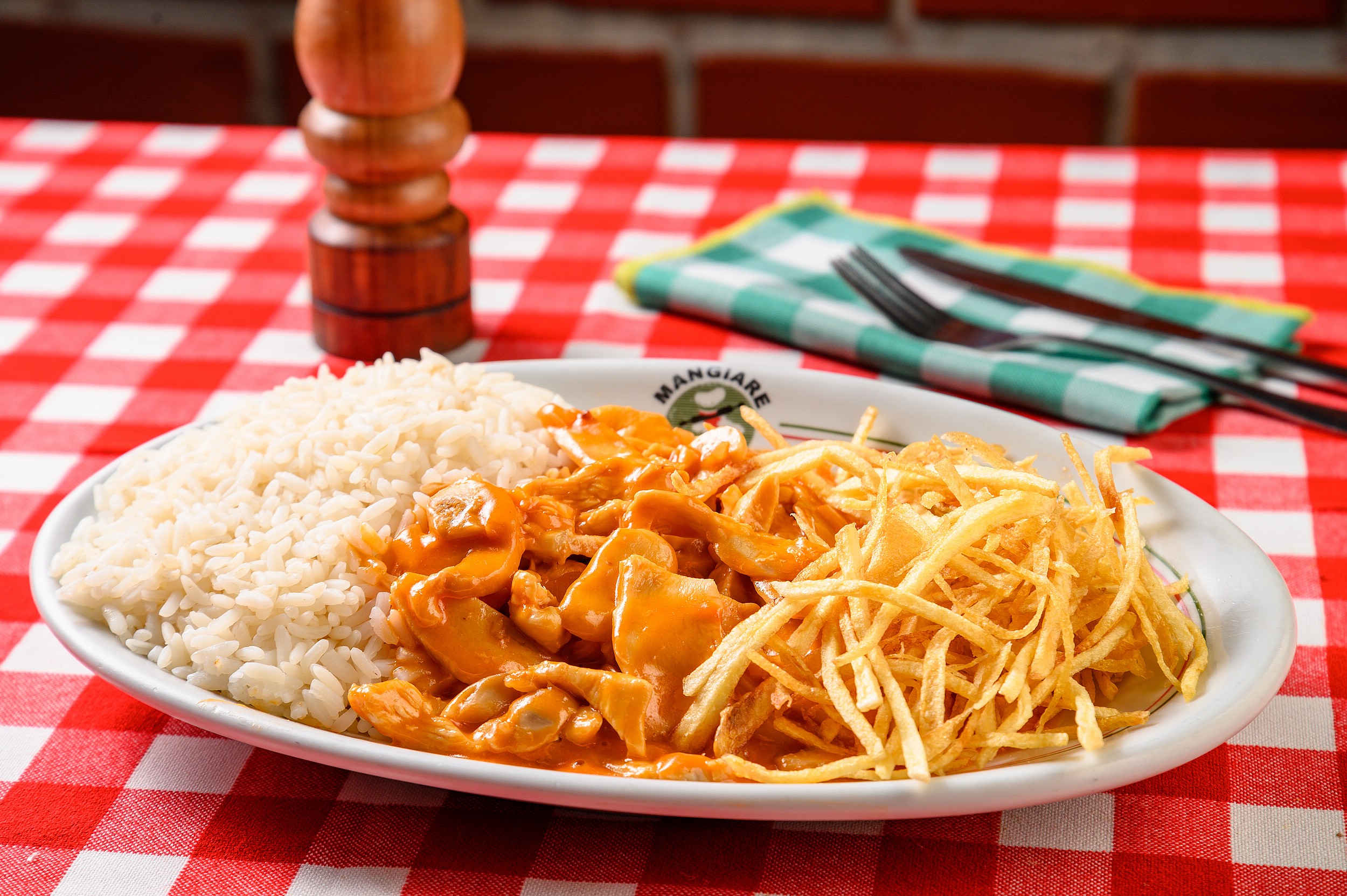 À milanesa ou grelhado, molho 4 queijos, com arroz ou tagliarini na manteiga