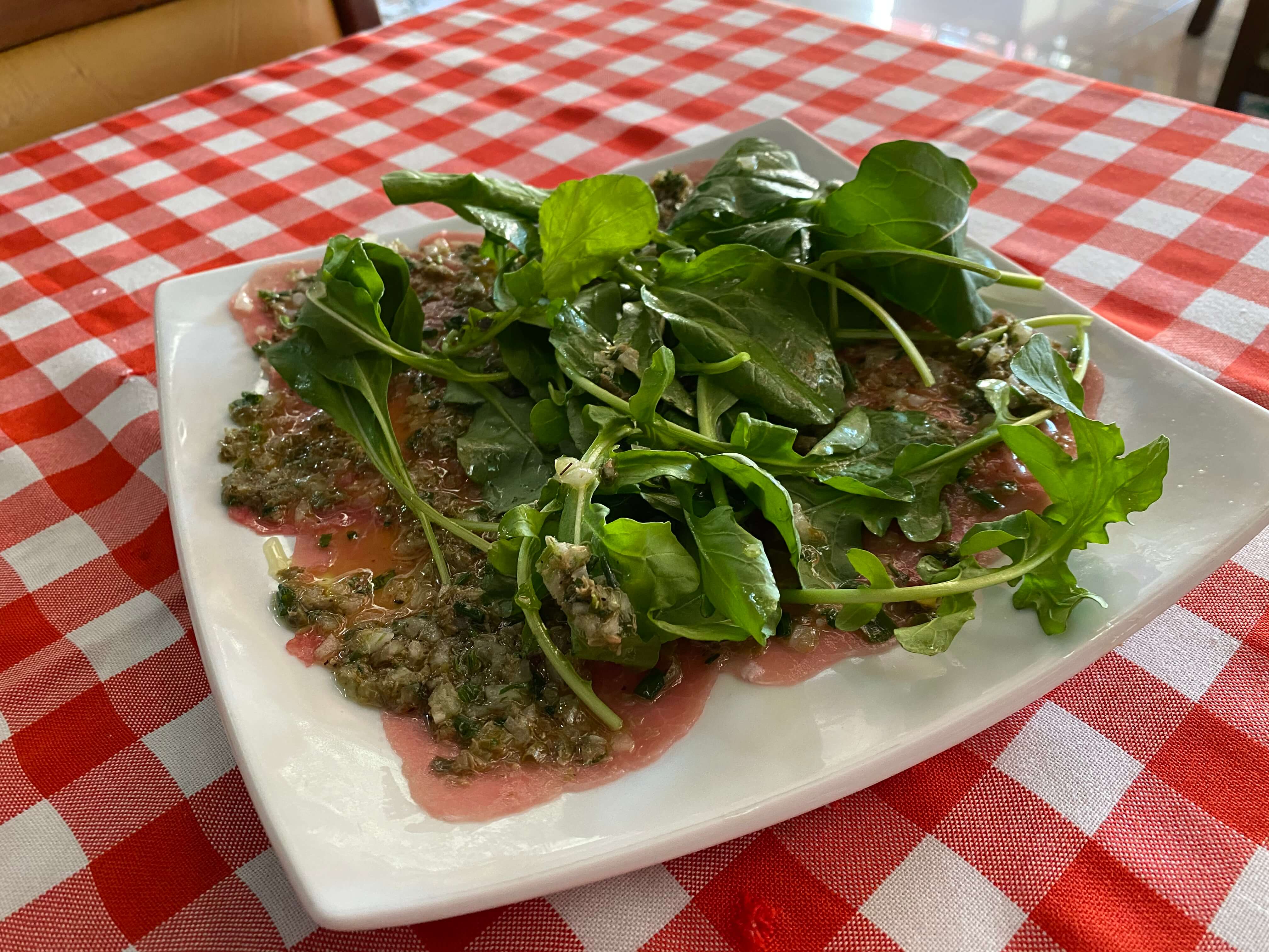 Carpaccio de carne bovina, tempero especial com alcaparras e rúcula fresca.