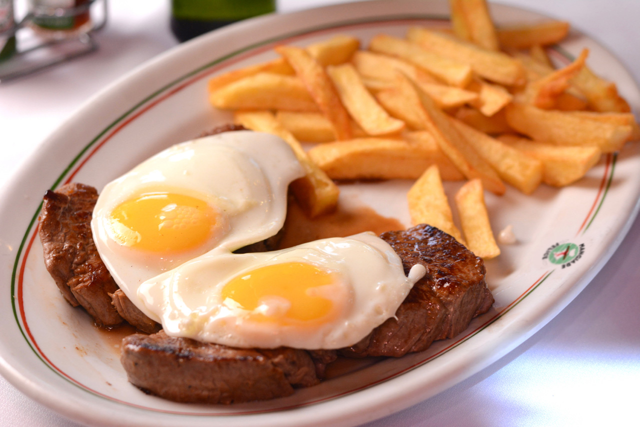 Grelhado, dois ovos fritos, batatas fritas e arroz.