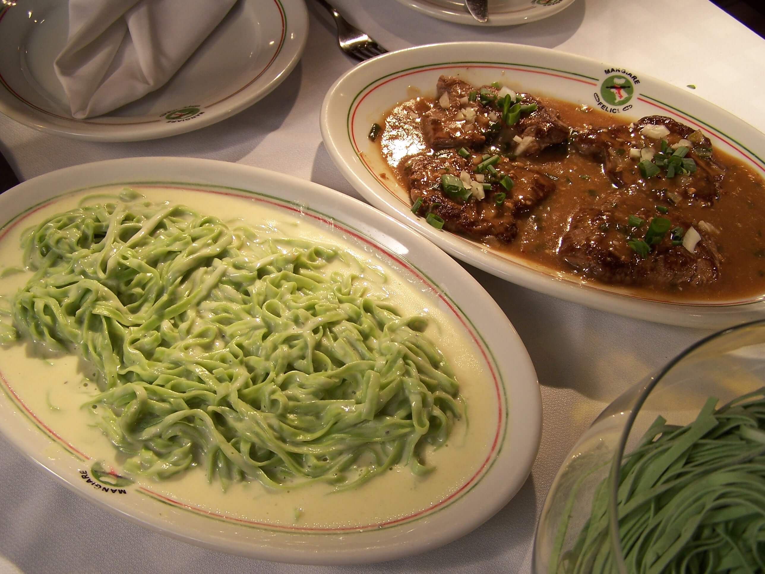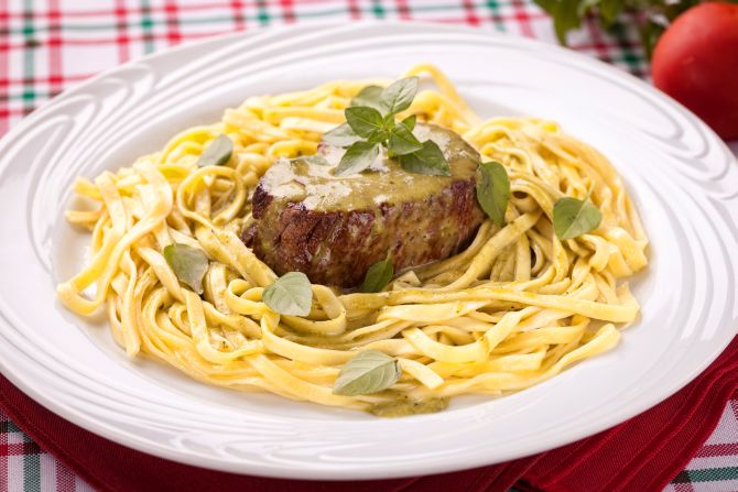 Fatiado, com molho madeira, aspargos, palmito, champignon, gratinado com parmesão. Com tagliarini ao molho branco.