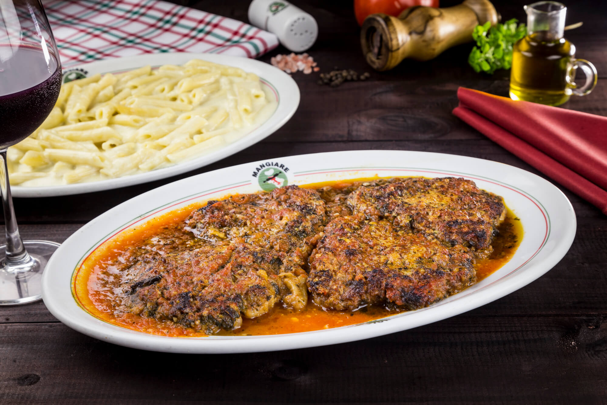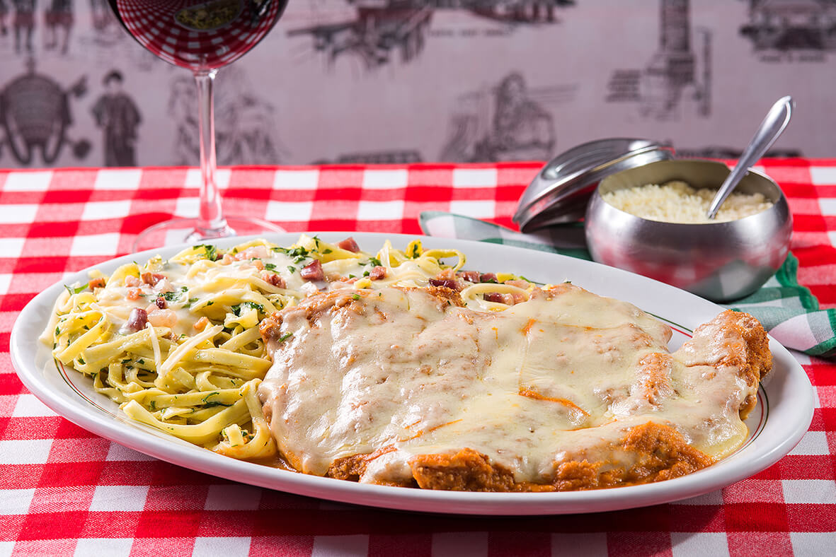 Empanado, molho sugo, gratinado com muçarela. Acompanha tagliarini à carbonara.