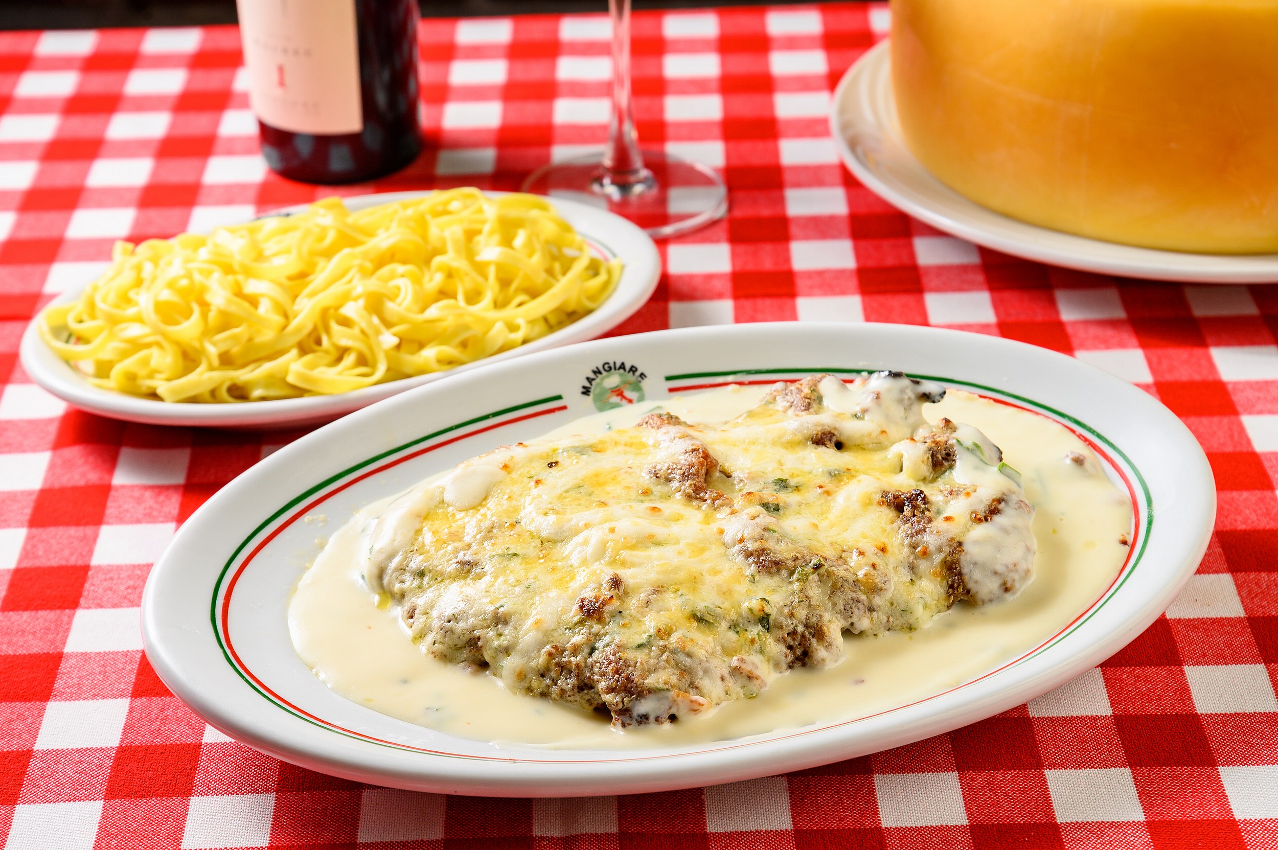 Mangiare Felice - Molho 4 queijos, dois escalopes de mignon à milanesa, pouco molho ao sugo, gratinado com parmesão