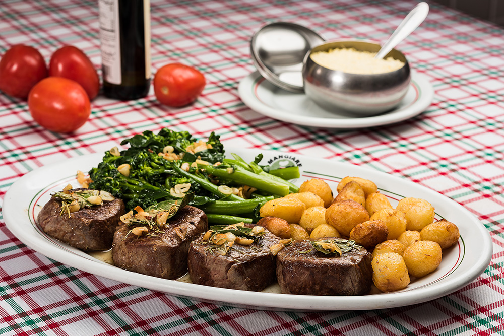Medalhões de mignon, risoto de funghi seco, presunto cru, calabresa, alcachofra, tiras de mignon, rúcula fresca e parmesão.