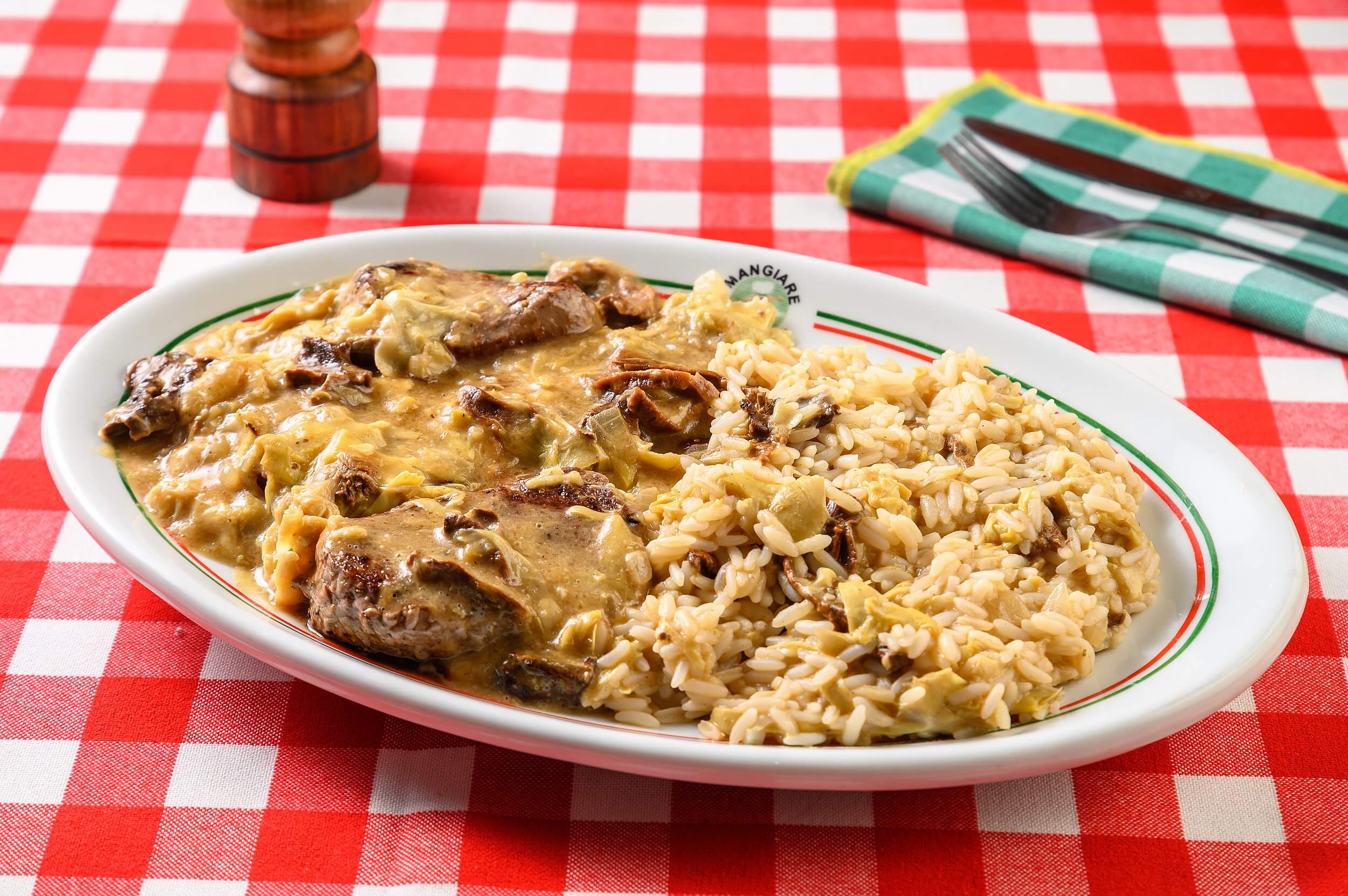 Grelhado, creme de leite, molho madeira, funghi italiano, fundo de alcachofra, presunto de parma, e arroz no molho.