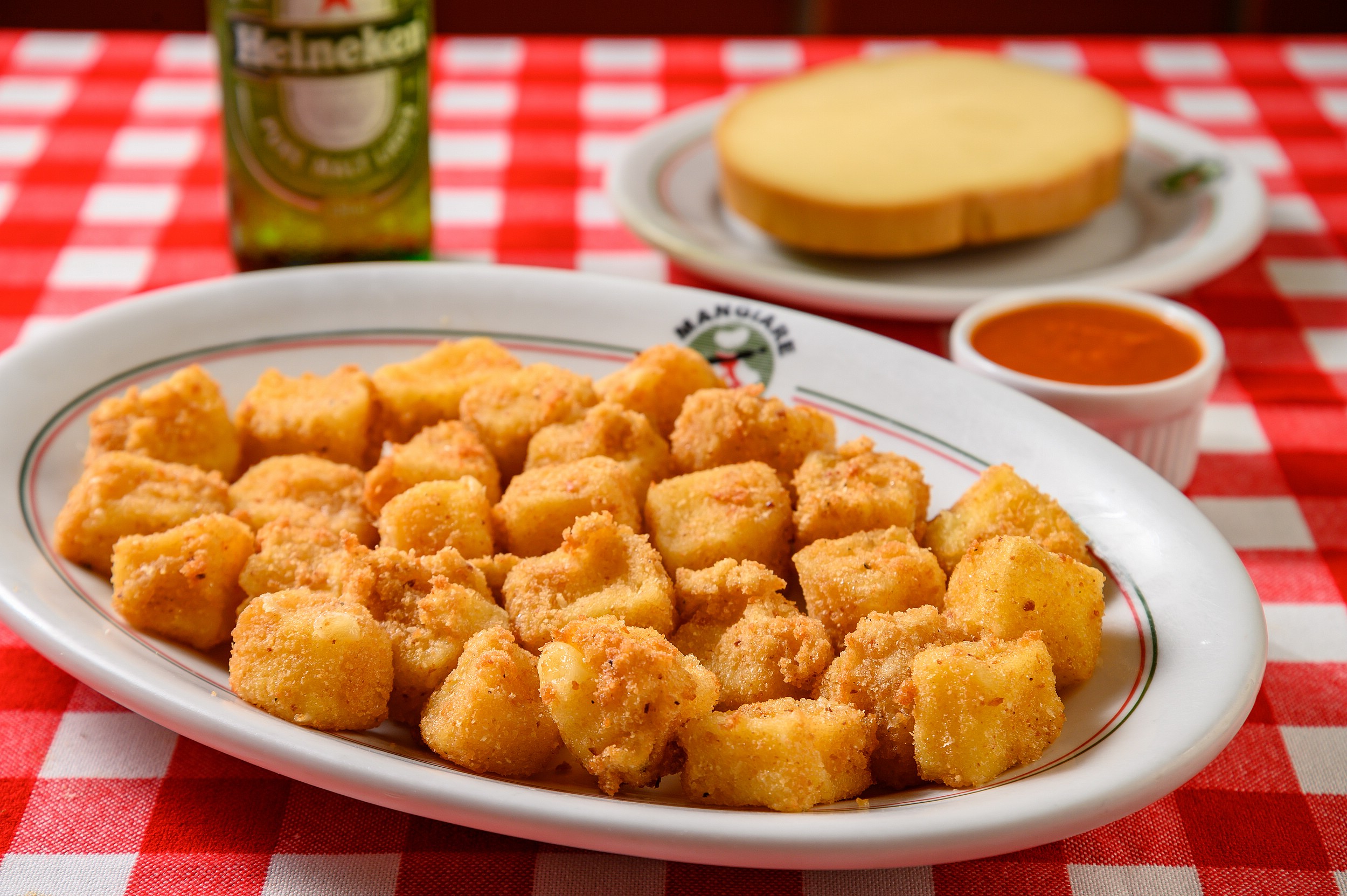 Frito ao alho com polenta frita, com parmesão e cheiro verde.