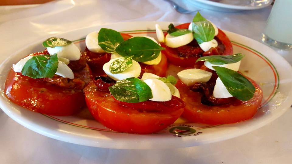 Tomate, muçarela de búfala, rúcula, tomate seco e manjericão.