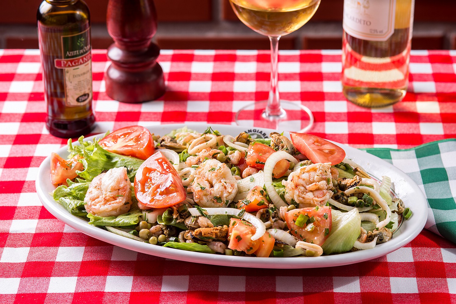 Alface americana, tomate, cebola, ervilha, lula, vôngoli, marisco e camarões