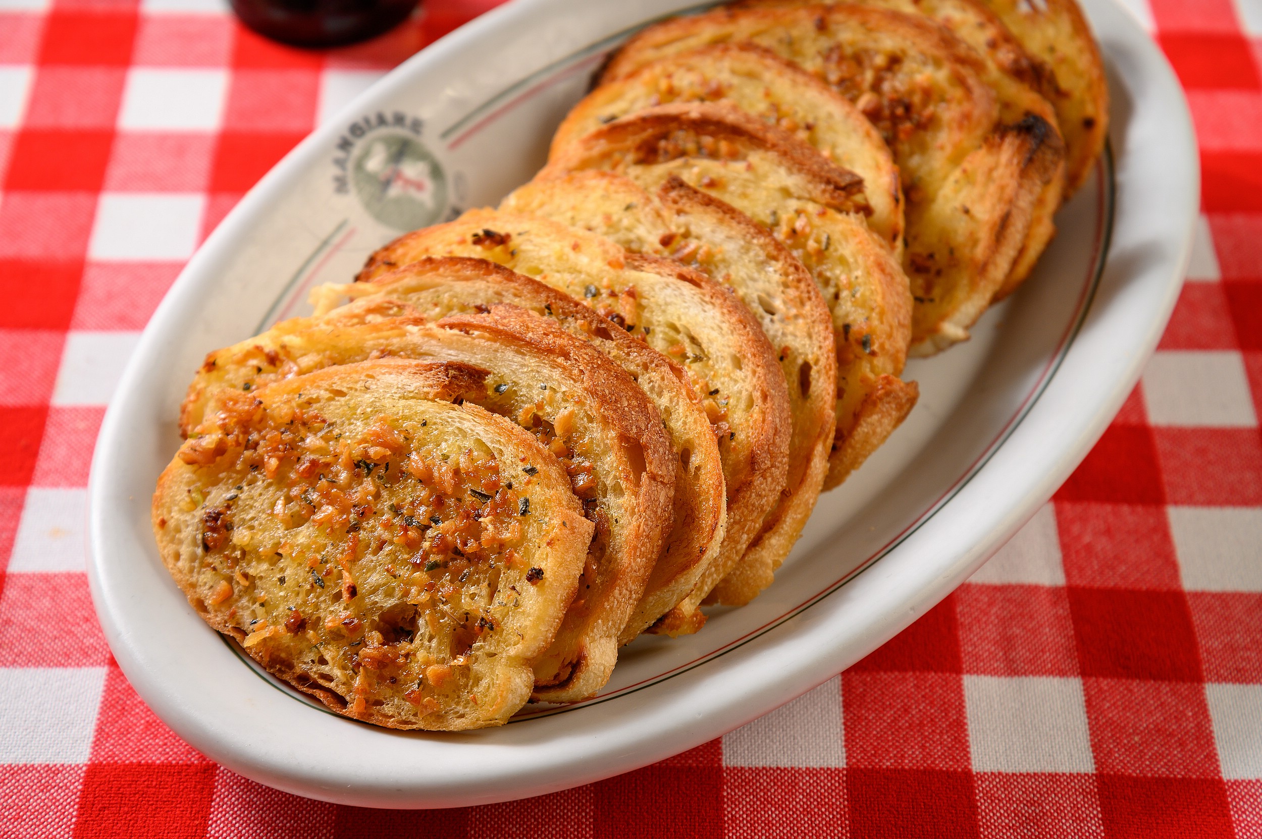 Fatias finas de pão italiano, com patê à base de alho, orégano e parmesão.
