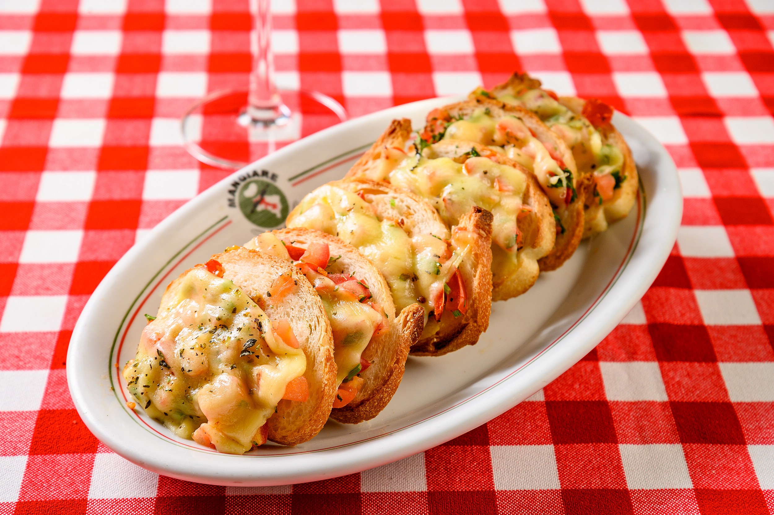Fatias finas de pão italiano, tomate em cubinhos, muçarela e orégano.
